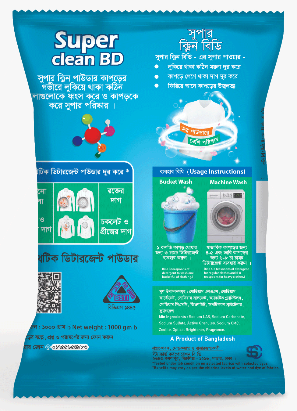 Super Clean BD is the best Detergent Powder what producing by Standard Corporation BD. Our vision is to serve people with best quality of product with reasonable price.